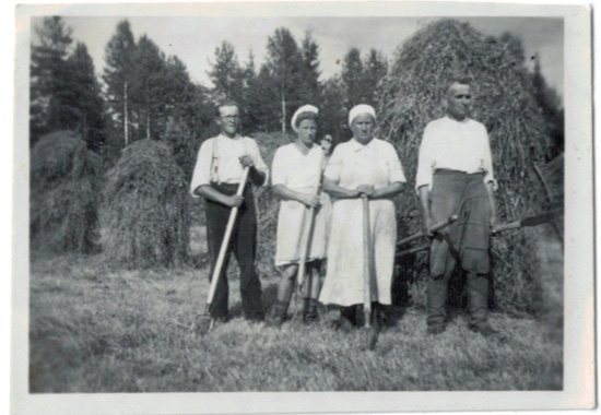 Vasemmalta Tauno, Kerttu, Alviina ja Lauri heinätöissä 1949 Massilanmäessä.