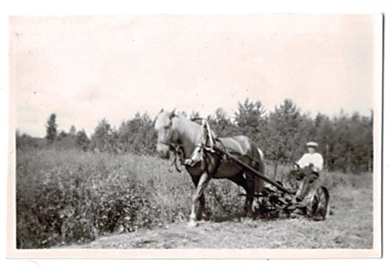 Lauri Härkänen niittää heinää savinkontaus pellolla vuonna 1949. On se heinä kasvanut silloinkin.